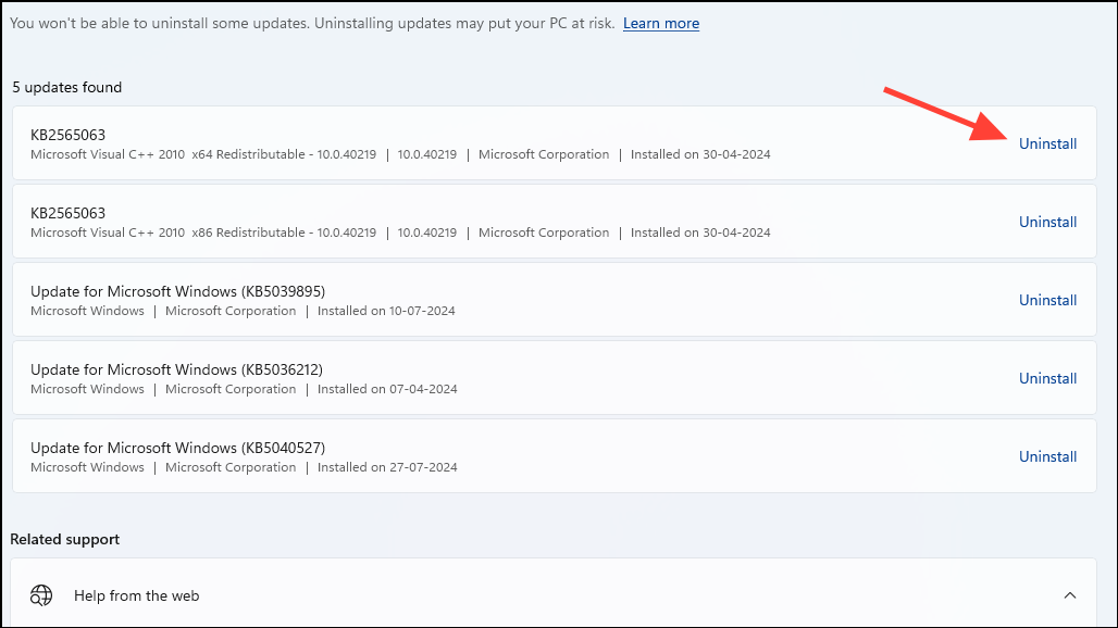 - You will see a list of the updates that you can uninstall. Click on 'Uninstall' on the right for the updates you want to remove. Restart your PC after that.