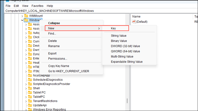 - Right-click on the 'Windows' folder and click on 'New' and then on 'Key'.