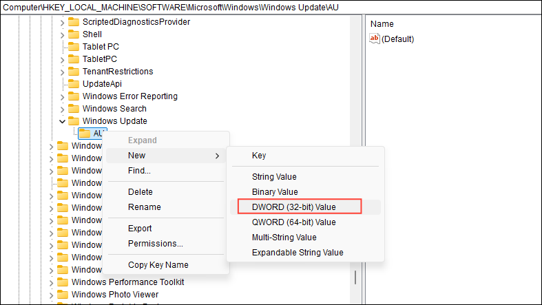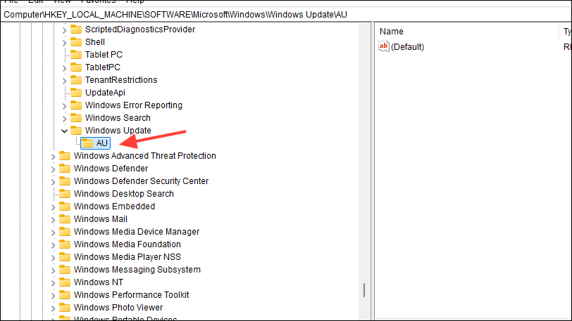 - Right-click on the new 'Windows Update' key and create another key. Name this key 'AU'.