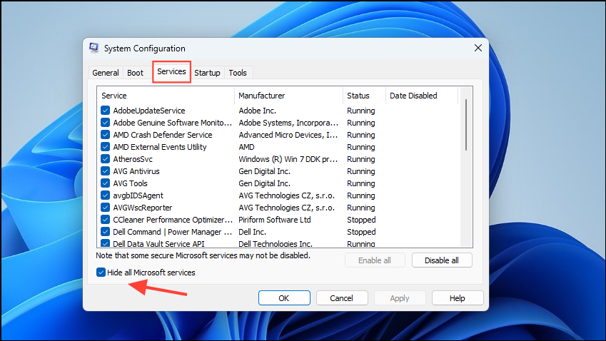 - When the System Configuration utility opens, click on the 'Services' tab at the top and then on the checkbox next to 'Hide all Microsoft services'.