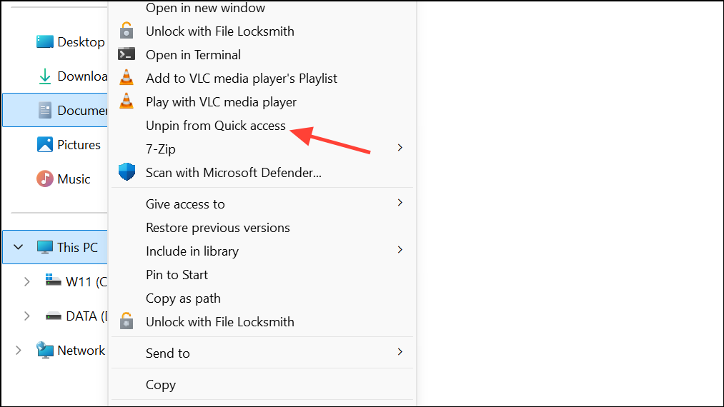 Step 2: Right-click each pinned folder under Quick Access and select Unpin from Quick access until no folders remain.