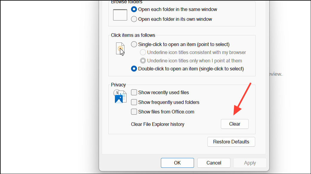 Step 4: Under the General tab, click the Clear button next to "Clear File Explorer history."