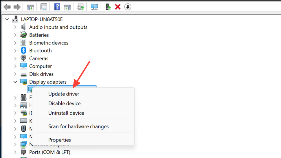 Step 2: Expand Display adapters, right-click your graphics card, and choose Update driver.
