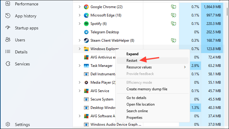 Step 2: Under the "Processes" tab, locate "Windows Explorer," right-click it, and select "Restart."