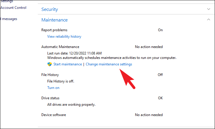 - Click on Change maintenance settings under the Maintenance section.
