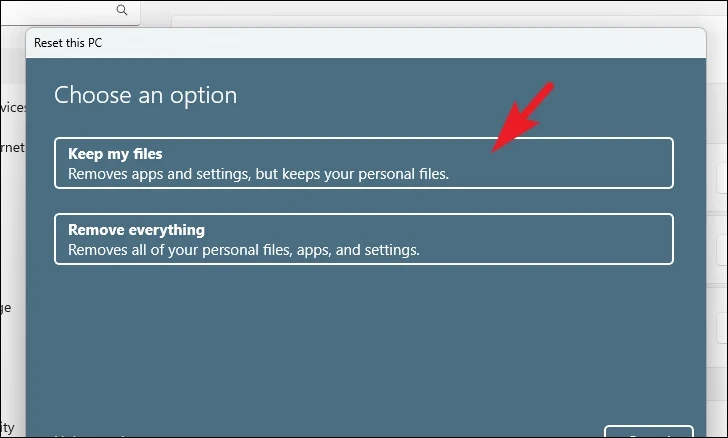 - Choose Keep my files to preserve your personal data, or Remove everything if you prefer a fresh start.
