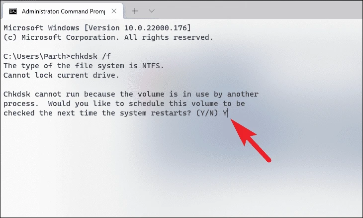 Yand pressEnter. - Restart your computer to allow CHKDSK to run.