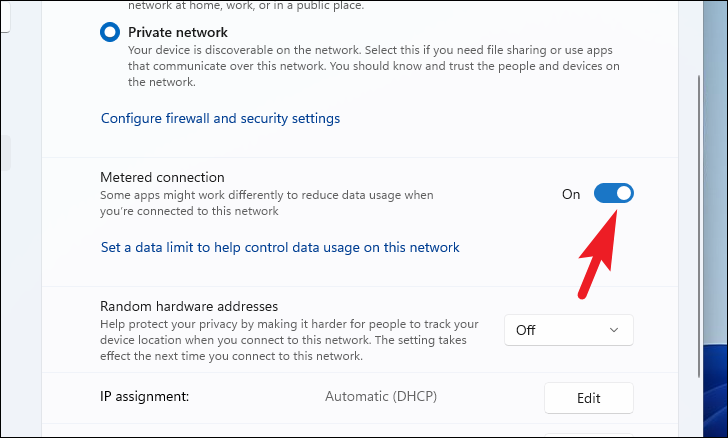 - Toggle the switch for Metered connection to On.