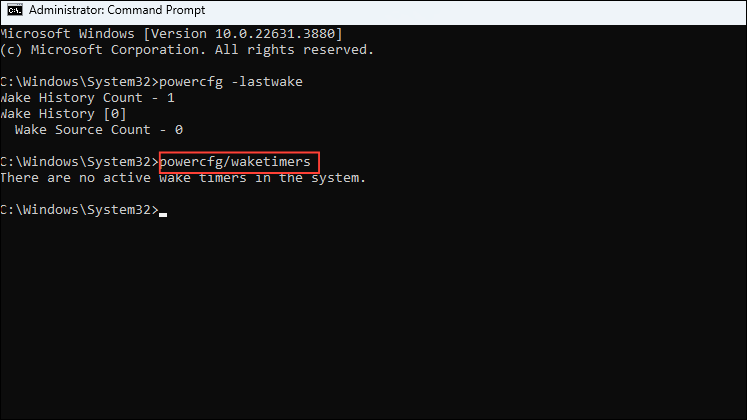 powercfg/waketimersin the command prompt window and pressing Enter.