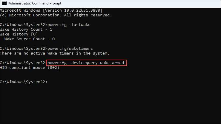 powercfg -devicequery wake_armedand press Enter to view the devices that are causing your PC to wake up randomly. The device responsible for the issue will show up in the command prompt window. For instance, here it is the HID-compliant mouse causing such an issue.