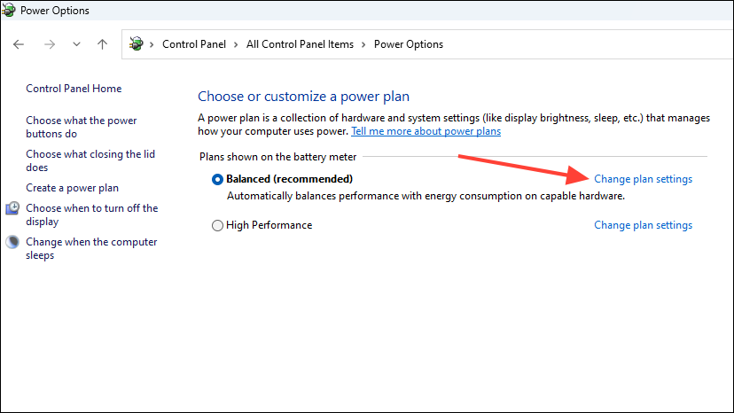 - On the Power Options page, click on 'Change Plan Settings' for your selected plan.