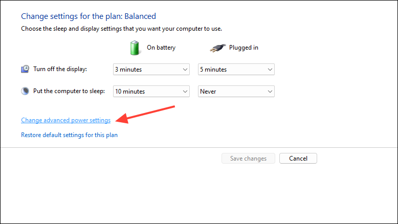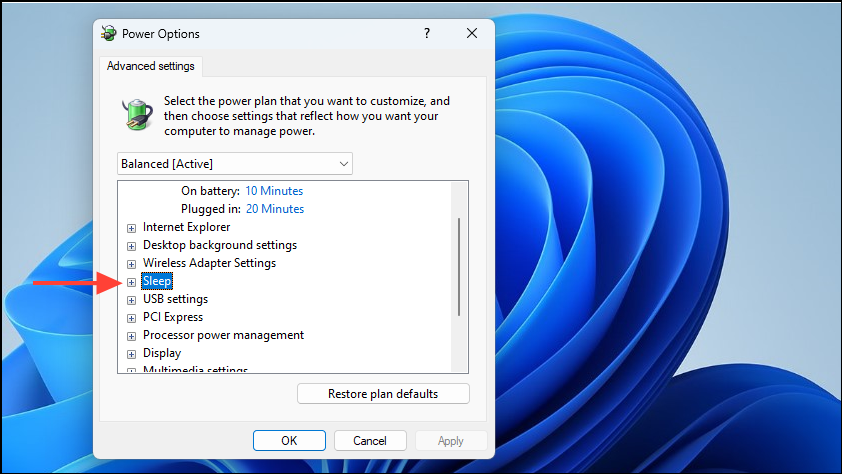 - When the Advanced Settings open up, click on the '+' sign next to the Sleep option to view related settings.