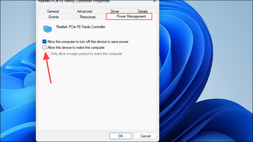 - In the Device Properties box, click on the Power Management tab on the top and then uncheck the box next to 'Allow this device to wake the computer'. Finally, click on the 'OK' button and reboot your PC.