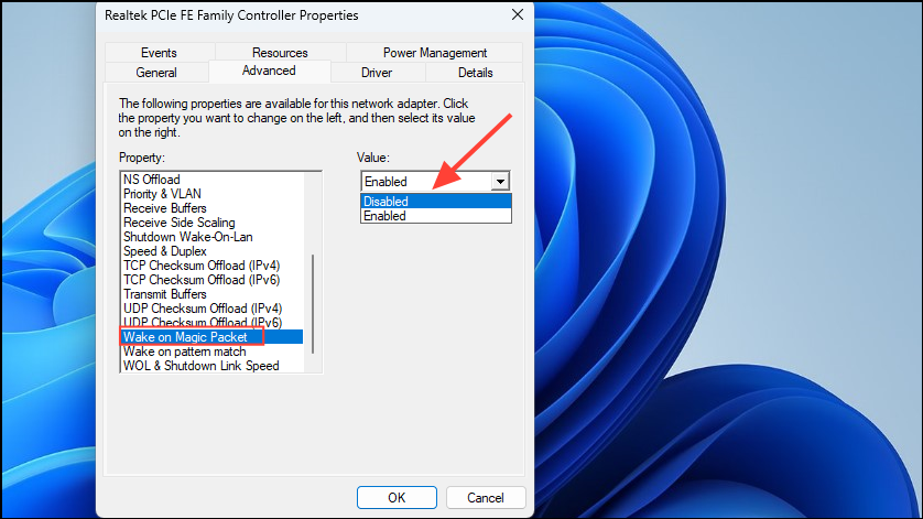 - Next, click on the 'Advanced' tab and scroll down and click on 'Wake on magic packet'. Then select 'Disabled' from the drop-down menu on the right and click on OK.