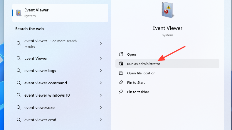 - Open the Start menu, search for 'Event Viewer', and open it as administrator.