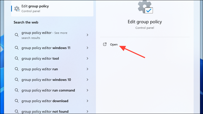 - Open the Start Menu, search for 'group policy editor', and open it.