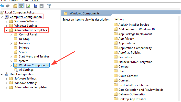 - When the Group Policy Editor opens, click on 'Administrative Templates' under Computer Configuration on the left, and then on 'Windows Components'.