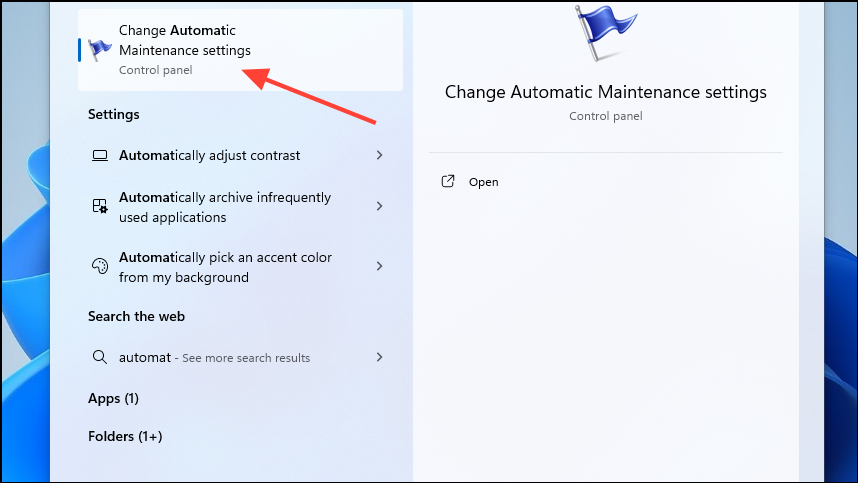 - Search for 'automatic maintenance' in the Start menu and click on 'Change Automatic Maintenance settings' when it appears.