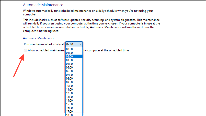 - When the Automatic Maintenance page opens up, you can select the time when it will run by using the drop-down menu. Alternatively, click and uncheck the box next to 'Allow scheduled maintenance to wake up my computer at the scheduled time'.
