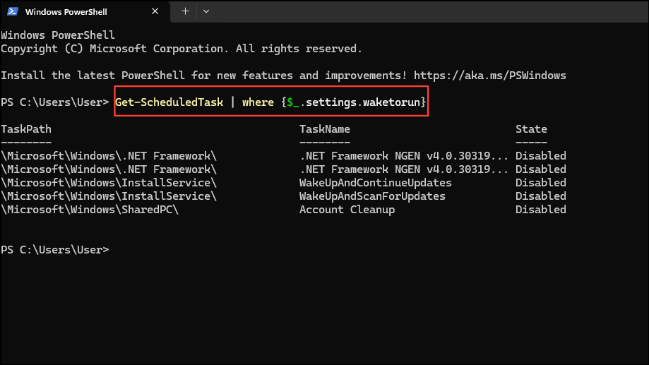 Get-ScheduledTask | where {$_.settings.waketorun}in the Powershell window and press Enter. This will show you scheduled tasks that can wake up your PC from sleep.