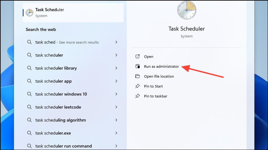 - Now, open the Start menu and search for 'Task Scheduler'. Click on 'Run as administrator' to open it.