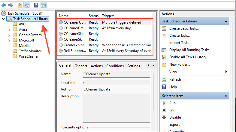- Once the Task Scheduler opens, click on the 'Task Scheduler Library' on the left and navigate to the task you want to stop from running and waking up your PC.