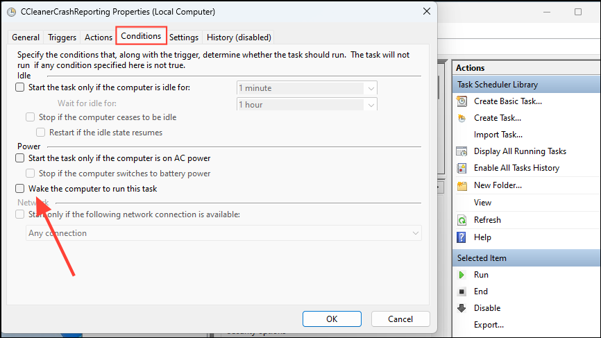 - Double-click on the task and then click on the 'Conditions' tab at the top and then uncheck the 'Wake the computer to run this task'.