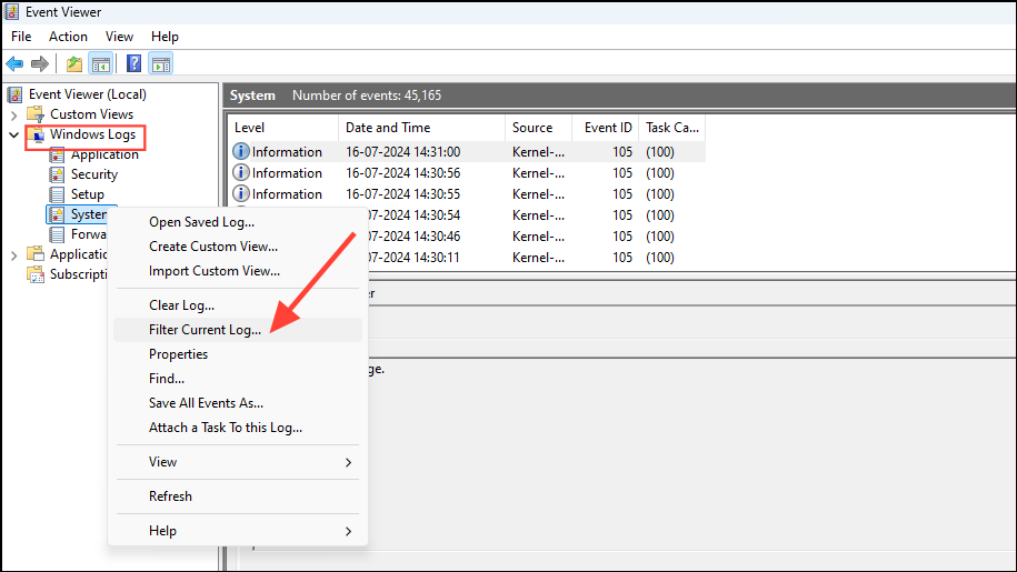 - When the Event Viewer opens, click on 'Windows Logs' on the left and right-click on 'System' before clicking on 'Filter Current Log'.