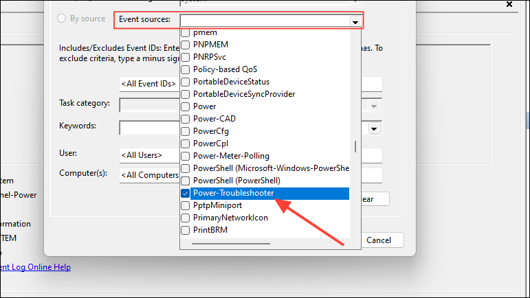 - Click on the Event Sources drop-down button and select 'Power Troubleshooter'. Then click on OK.