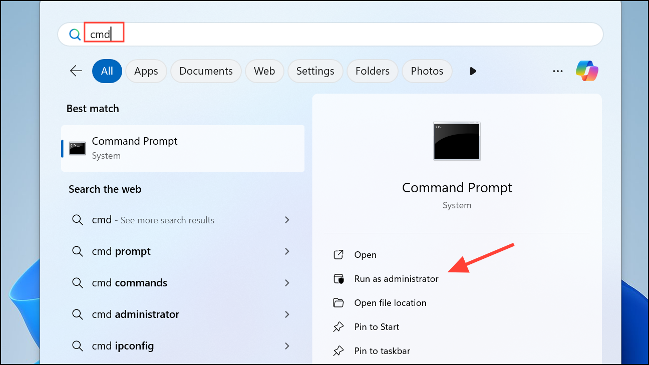 Step 1: Open Command Prompt as administrator. Type "cmd" in the search bar, right-click "Command Prompt," and choose "Run as administrator."