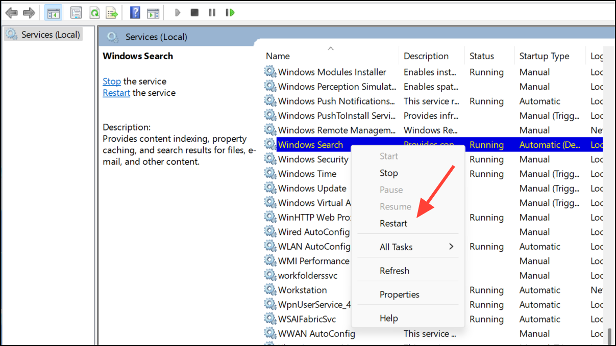 Step 2: In the Services window, find "Windows Search," right-click it, and select "Restart." If the option is greyed out, select "Stop," wait a moment, then select "Start."