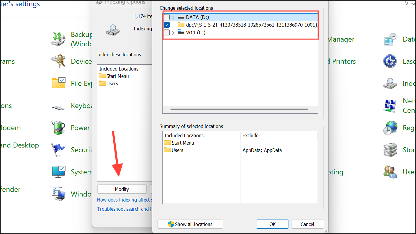 Step 3: Click "Modify," then uncheck folders that don't require indexing. Typically, you can exclude temporary or rarely accessed folders.