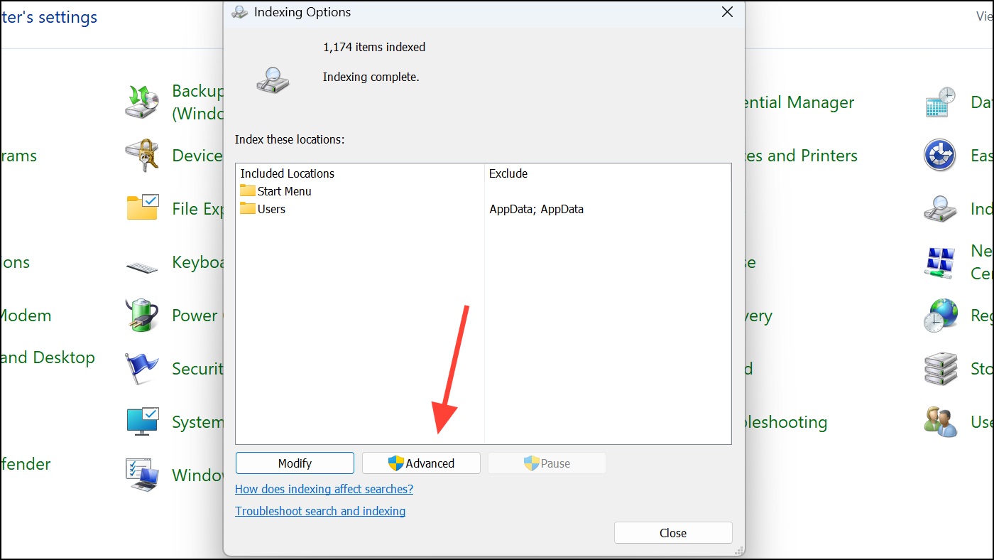 Step 1: Open "Indexing Options" as described earlier and click "Advanced."