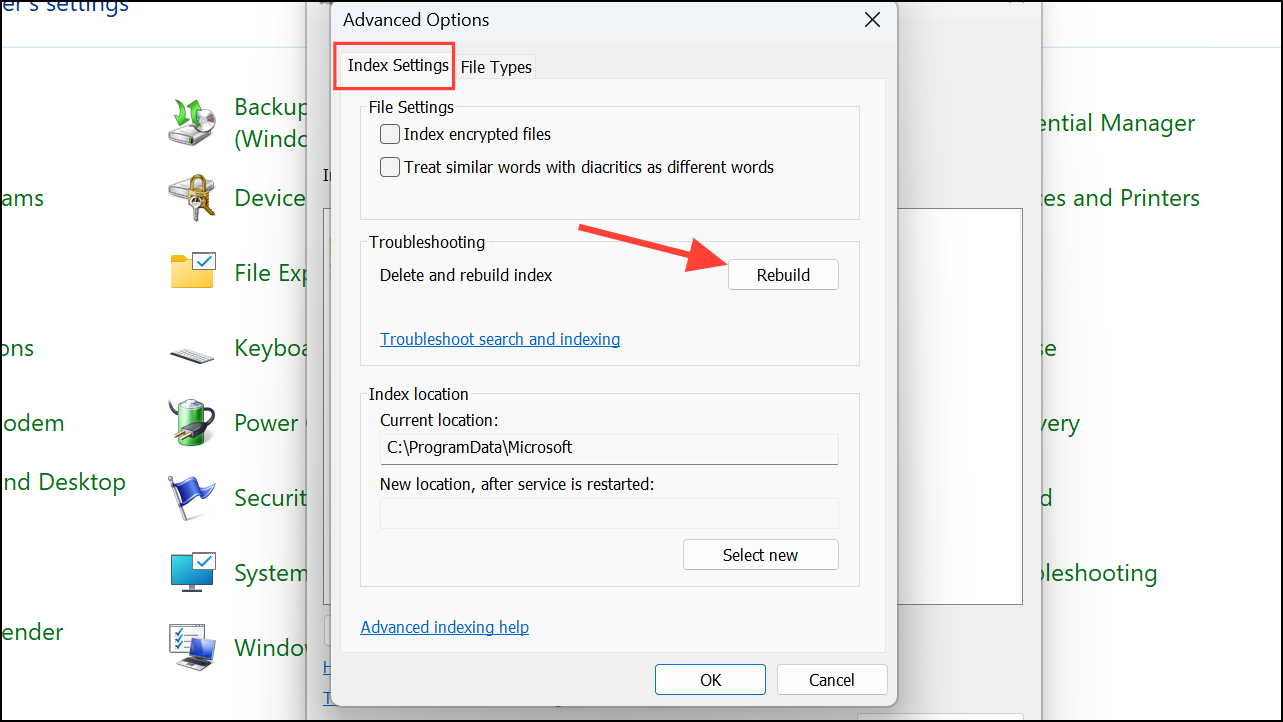 Step 2: Under the "Index Settings" tab, click "Rebuild." Confirm the action when prompted.