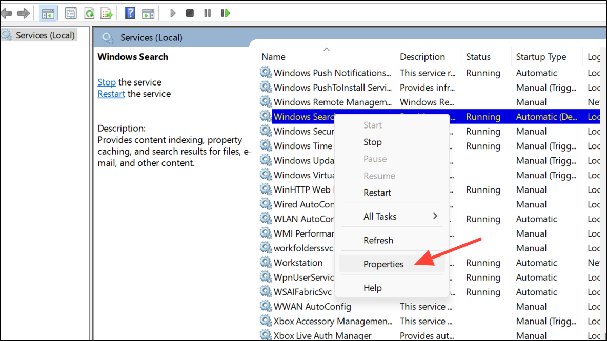 Step 2: Locate "Windows Search," right-click it, and select "Properties."