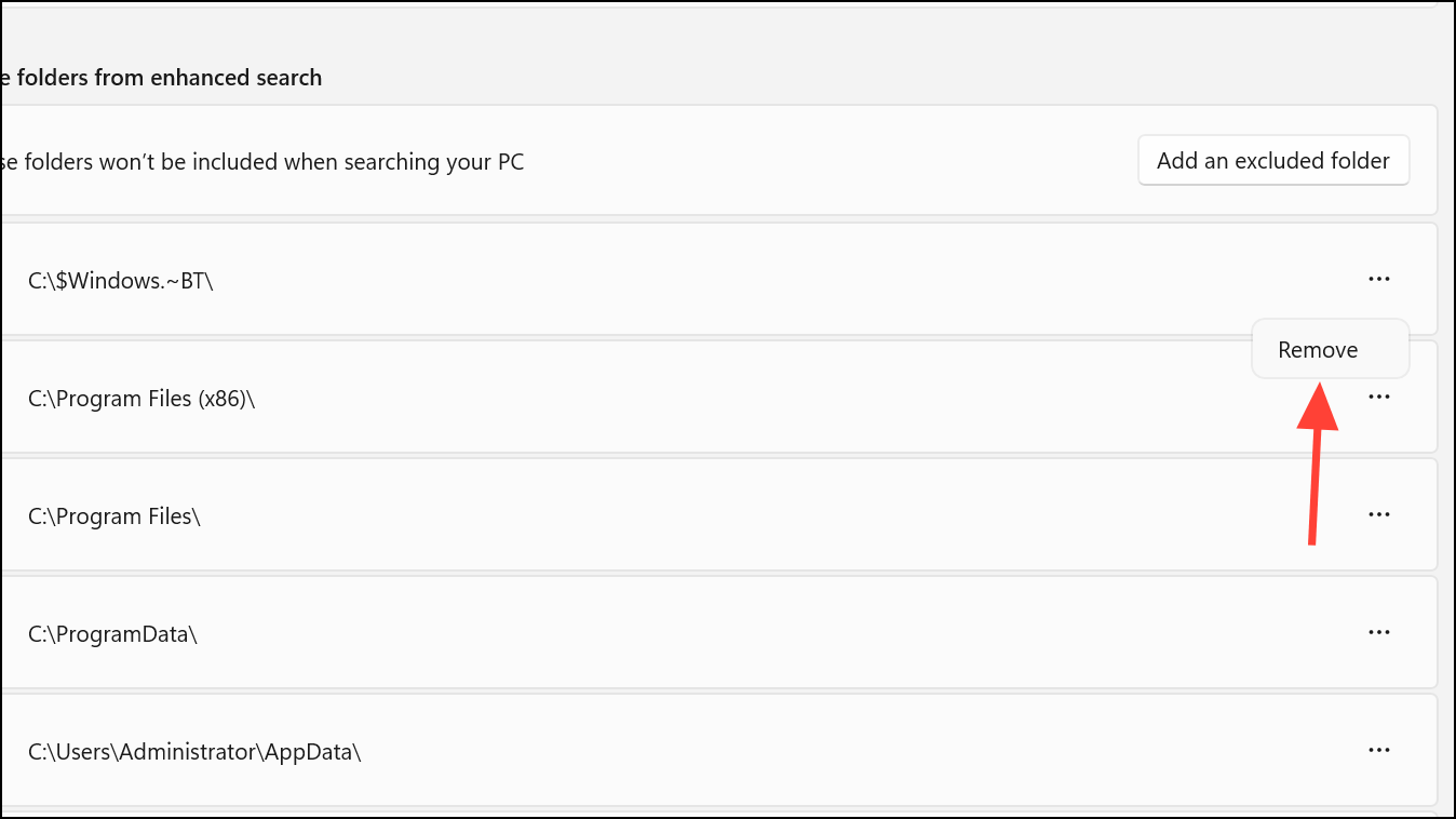 Step 4: Below the search mode options, review the “Exclude folders from enhanced search” list. Remove any folders you want included in search results by clicking Remove after clicking the tree dots on the right next to each option. This ensures Windows indexes every location you need.