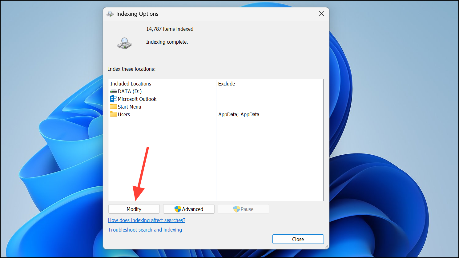 Step 2: In the Indexing Options window, confirm that your desired folders and drives are listed. If not, click Modify and add them.