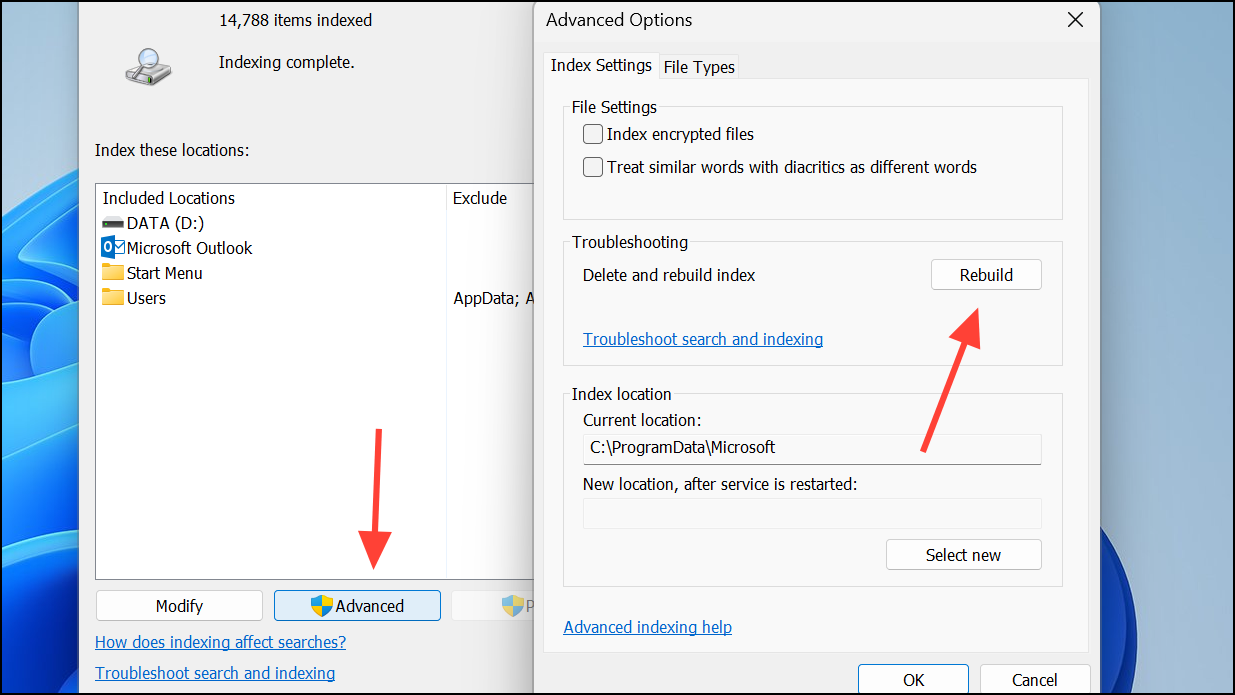 Step 3: Click the Advanced button. In the new dialog, under the “Troubleshooting” section, click Rebuild. Agree to the prompt. Windows will delete the old index and start a fresh scan of all selected locations.