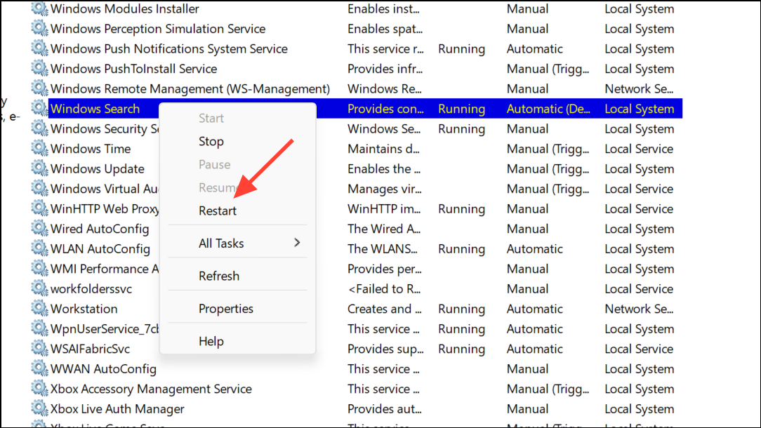 Step 2: In the Services window, scroll down to Windows Search. Right-click and select Restart. If the service is not running, choose Start instead.