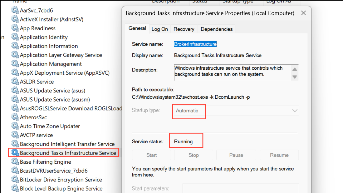 Step 4: Optionally, check related services like Background Task Infrastructure Service and RPC (Remote Procedure Call) to make sure they’re running and set to Automatic as well.