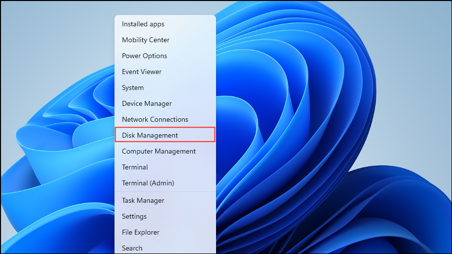 Step 4: Now, open Disk Management by pressing Win + X and selecting "Disk Management."