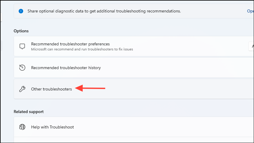 Step 2: Select "Troubleshoot" from the right pane, then click on "Other troubleshooters."