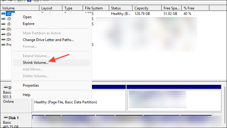 Step 5: Locate your OS partition (usually labeled "C:") and right-click it, choosing "Shrink Volume." Shrink the OS partition by at least 250MB to create free space.
