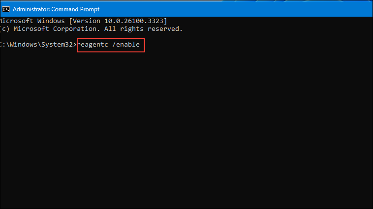 Step 8: Once done, return to the Command Prompt and re-enable WinRE by running reagentc /enable. Verify the partition status again with reagentc /info to confirm it is active.
