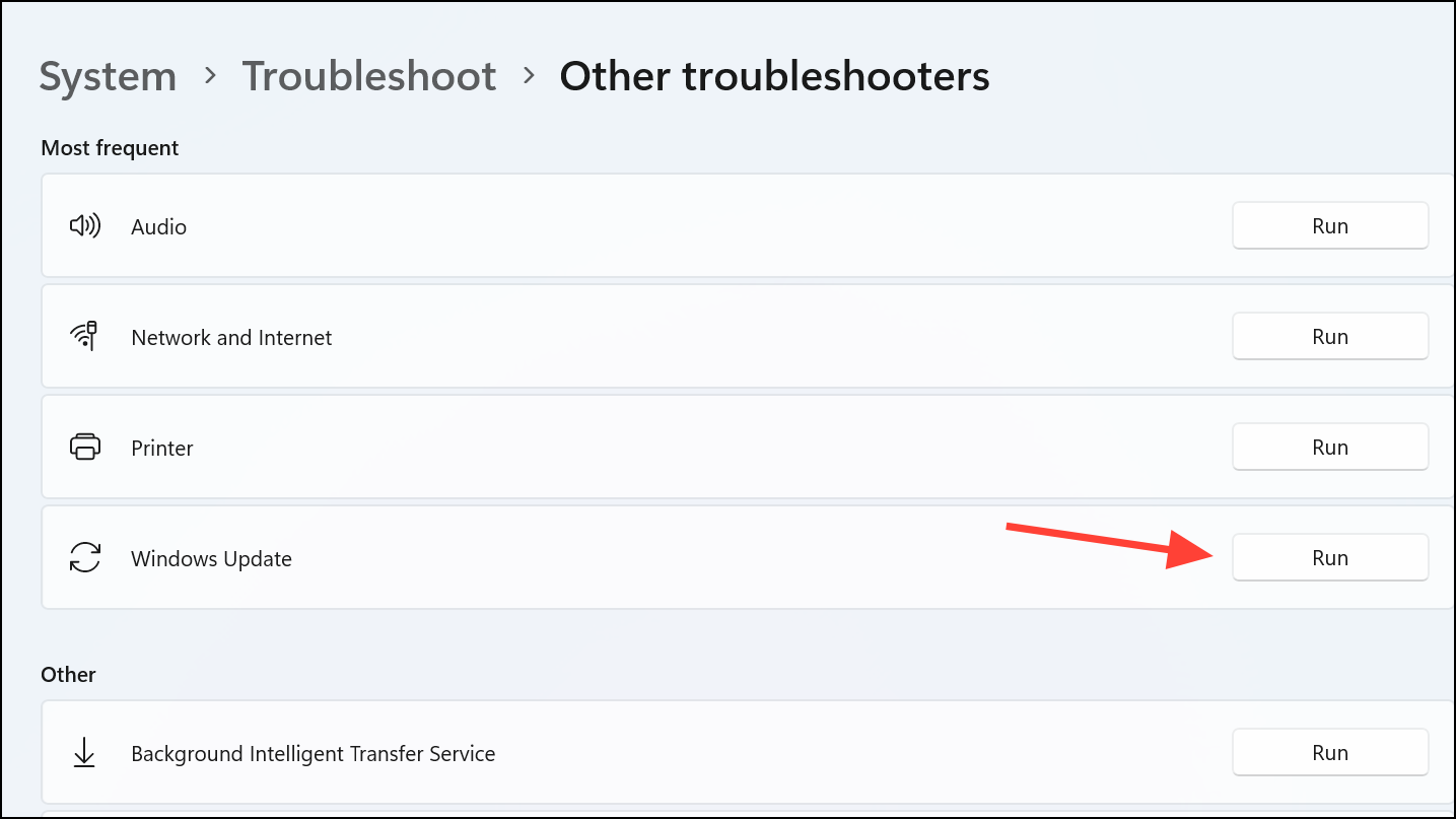 Step 2: Under the "Get up and running" section, select Windows Update and then click Run the troubleshooter on Windows 10. On Windows 11, click Other troubleshooters and then click Run to the right of Windows Update. Follow the on-screen instructions to complete the troubleshooting process.