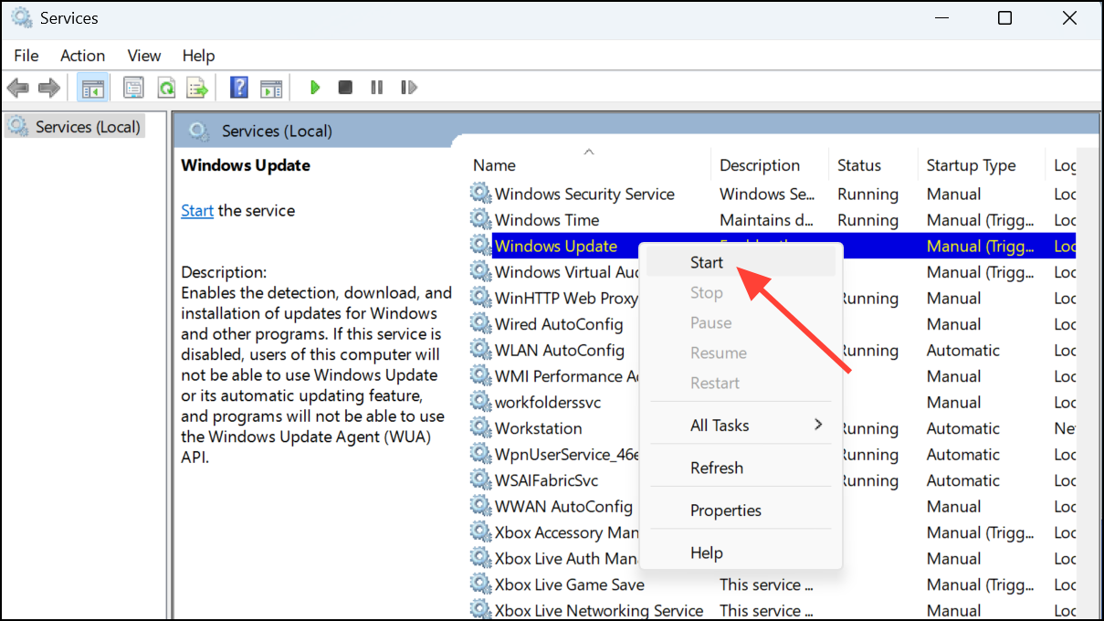 Step 4: Return to the Services window, right-click Windows Update, and select Start. Restart your PC and attempt to install updates again.