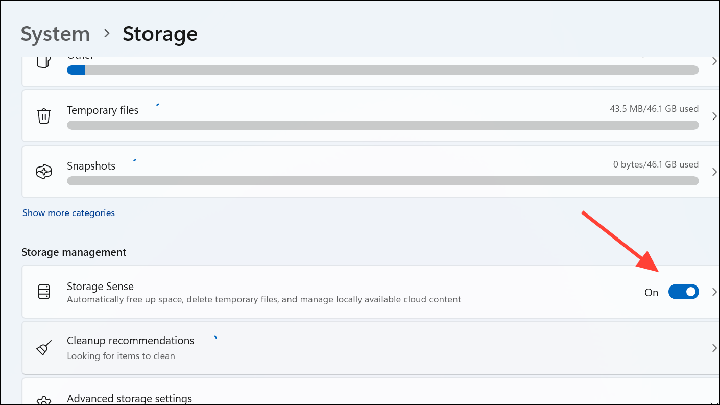 Step 1: Open Settings, navigate to System > Storage, and enable Storage Sense, which automatically removes unnecessary files.