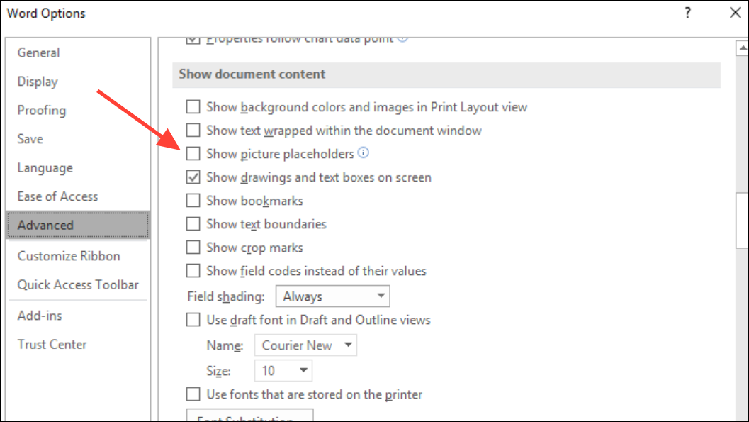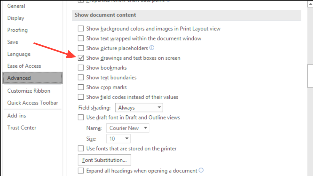Step 2: Turn off “Show drawings and text boxes on screen” in Options > Advanced > Show document content if the document contains many graphical objects.