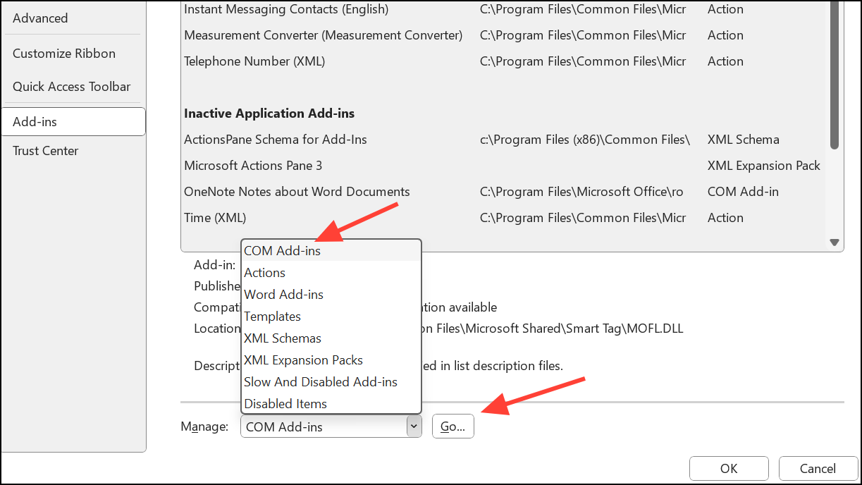 Step 2: If performance improves, disable add-ins one by one via File > Options > Add-Ins and use the “Go” button at the bottom of the dialog to manage COM Add-ins.