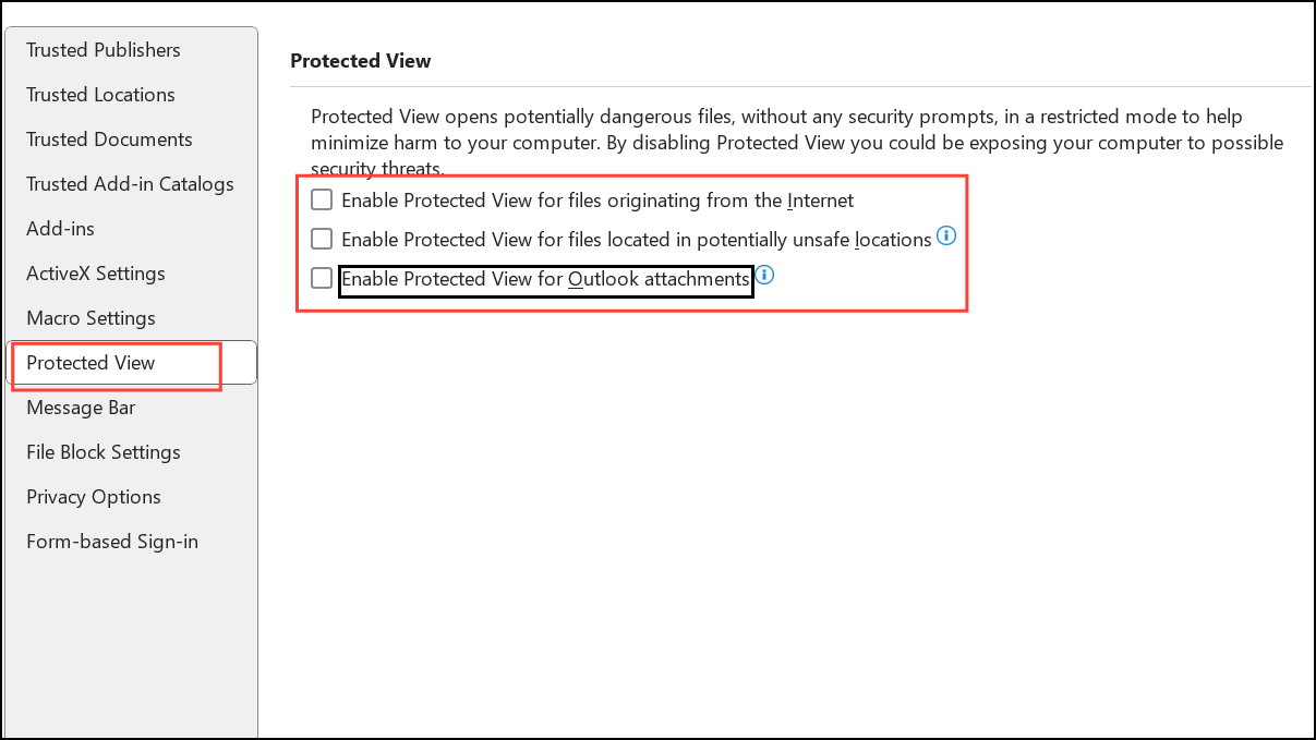 Step 3: Select Protected View. Here, you'll see several checkboxes: "Enable Protected View for files originating from the Internet," "Enable Protected View for files located in potentially unsafe locations," and "Enable Protected View for Outlook attachments." Uncheck the boxes that apply to your situation, but be aware this reduces some security protections.